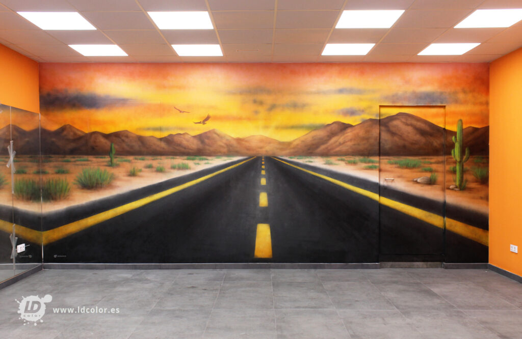 Proyecto realizado en una tienda/taller de motos. Para el interior nos decidimos por un icónico paisaje de carretera, que además de aportar una sensación de amplitud y libertad, encaja a la perfección con el mundo del motor.